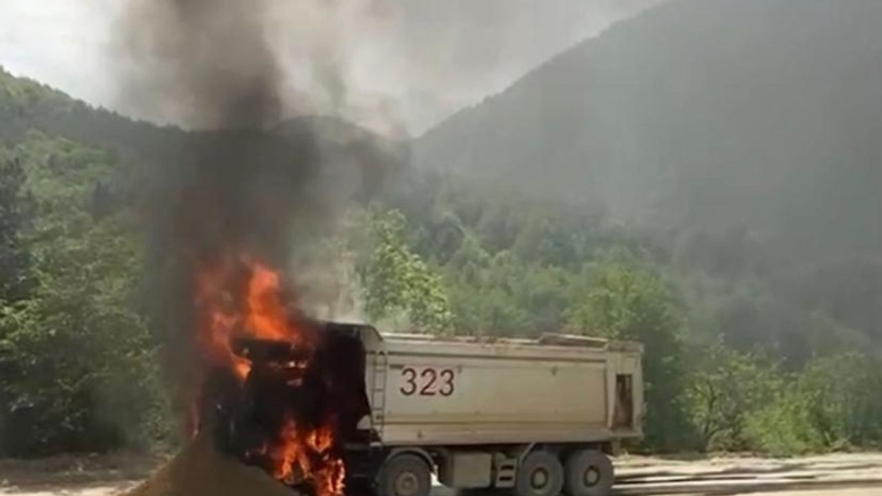 Sinop’un Türkeli ilçesi Gökçealan köyünde, İ.B. idaresindeki 06 DCM 423 plakalı kamyonunun kupa kısmı bilinmeyen bir nedenle alev aldı.