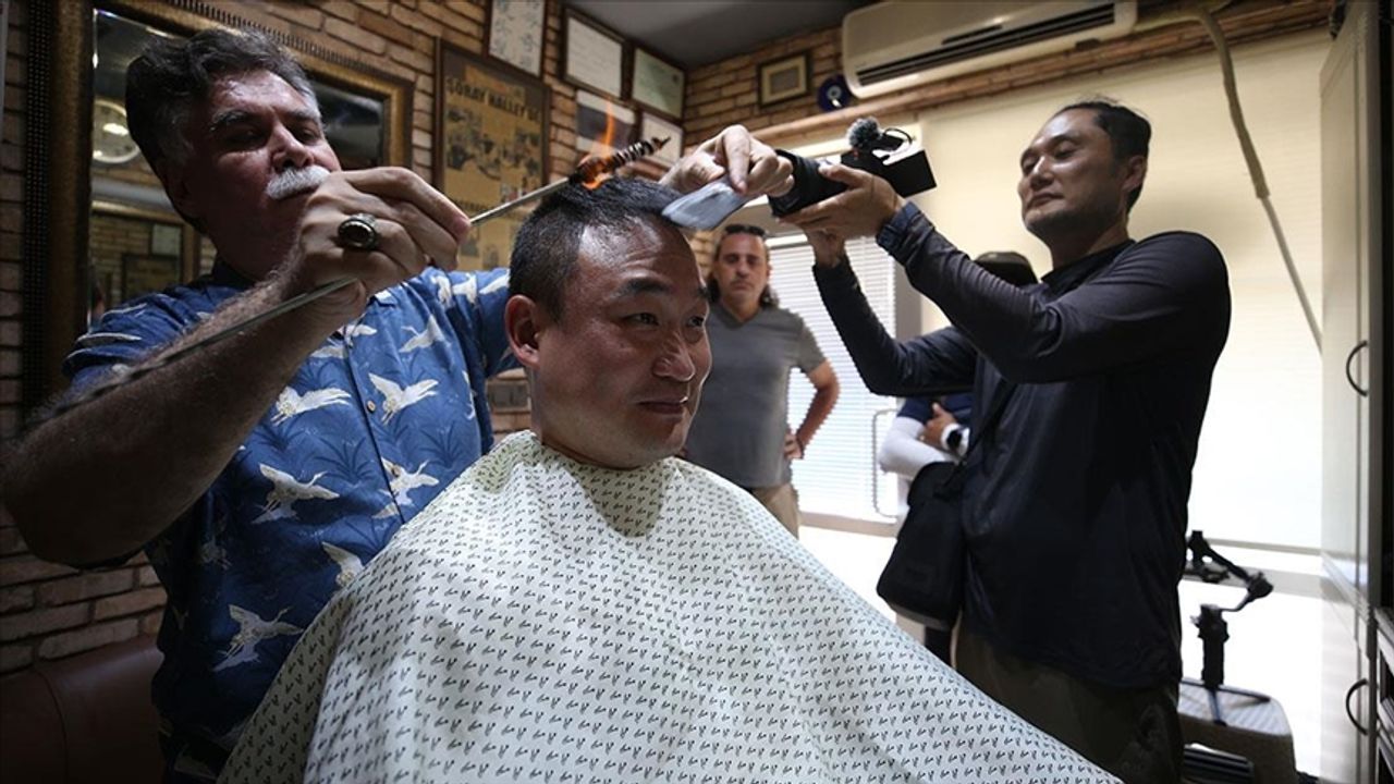 Ateşle tıraşın ardından makasla saça son şeklini veren berber Selahattin Aytekin ise Güney Kore'den gelen televizyon ekibine teşekkür etti.