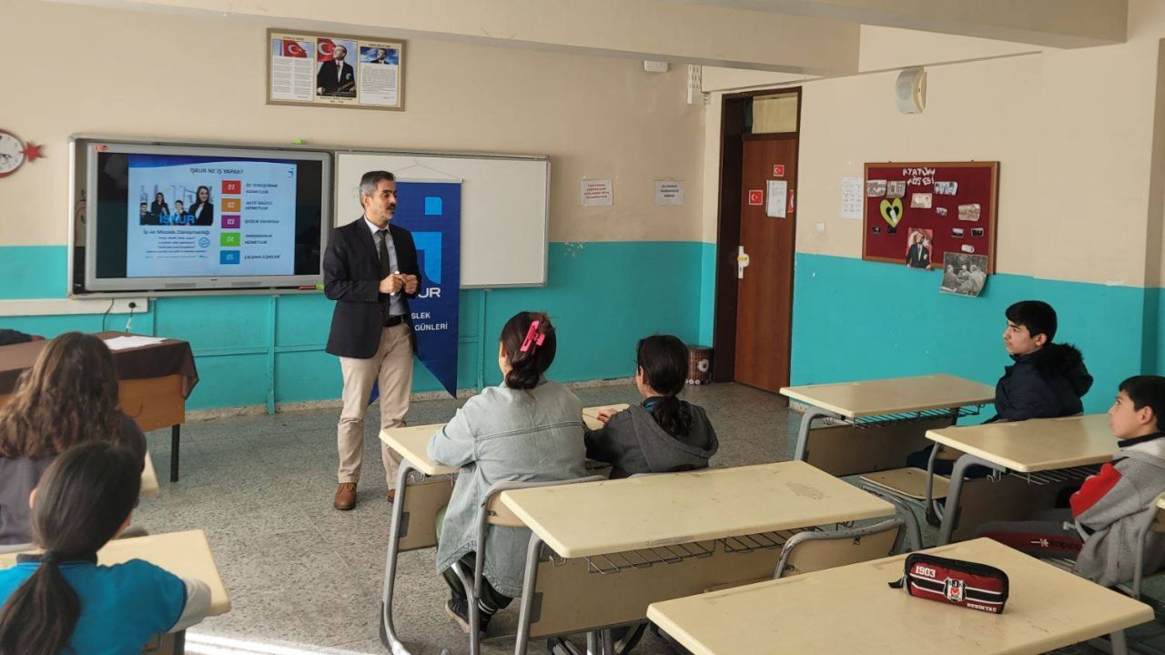 Aydın Çalışma ve İş Kurumu İl Müdürlüğü (İŞKUR), gençlerin erken yaşta çalışma hayatını tanımaları amacıyla bilgilendirme faaliyetlerini sürdürüyor. Bu kapsamda İş ve Meslek Danışmanı Mustafa Ceviz, Umurlu Eğrikavak Ortaokulu öğrencileriyle bir araya gelerek “İŞKUR’un Çalışma Hayatındaki Rolü ve Danışmanlık Faaliyetleri” konulu bir sunum gerçekleştirdi.