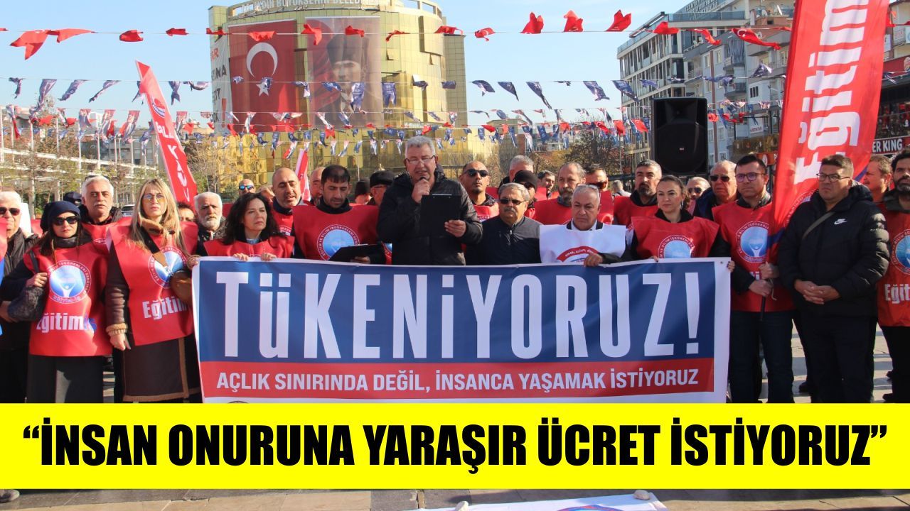 Basın açıklamasında konuşan Eğitim – İş Aydın Şubesi Mali Sekreteri Ali Başdemir, “AKP iktidarının emekçiyi yoksullaştıran, sermayeyi koruyan ekonomi politikalarına karşı insanca yaşam, adil ücret ve hakça paylaşım talebiyle iş bırakıyoruz” dedi.