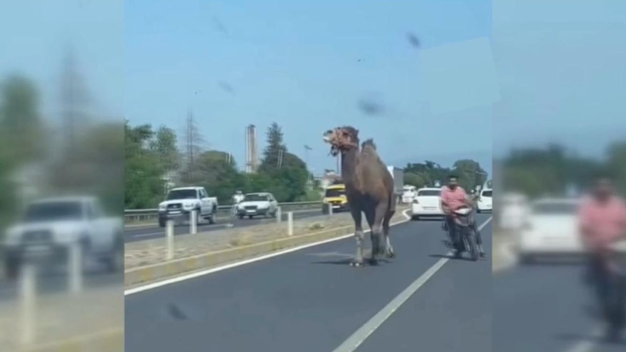 Ters yöne giren devenin sahibi, yoldan çıkarmak için hayvanı motosikletle takip etti.