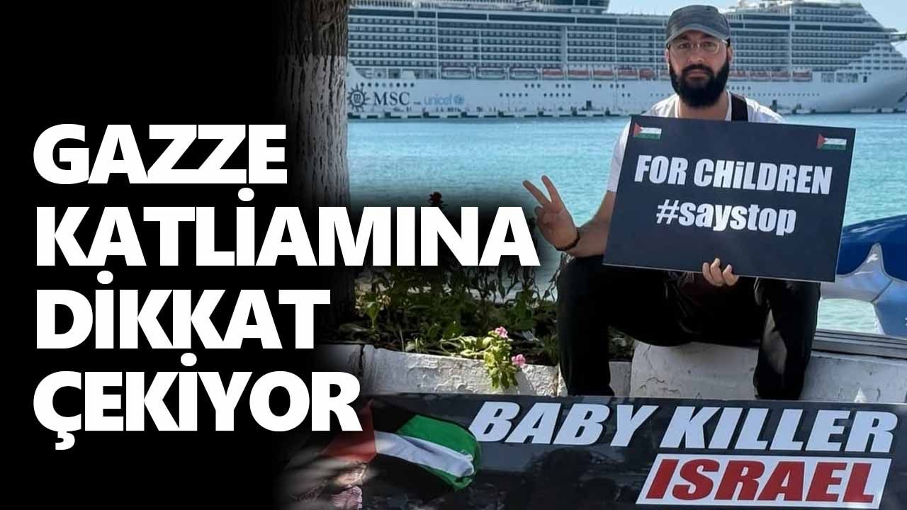 Aydınlı gazeteci ve aktivist Veysel Karahan, Gazze'de yaşanan katliama dikkat çekmek amacıyla bölgedeki turistik alanlarda oturma eylemi gerçekleştiriyor.