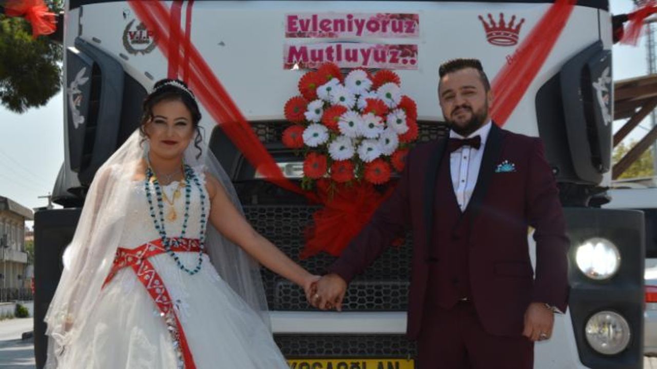 "Evleniyoruz, mutluyuz" yazısı asılan tırla şehir turu atan çifti çevredeki vatandaşlar alkışlarla karşıladı.
