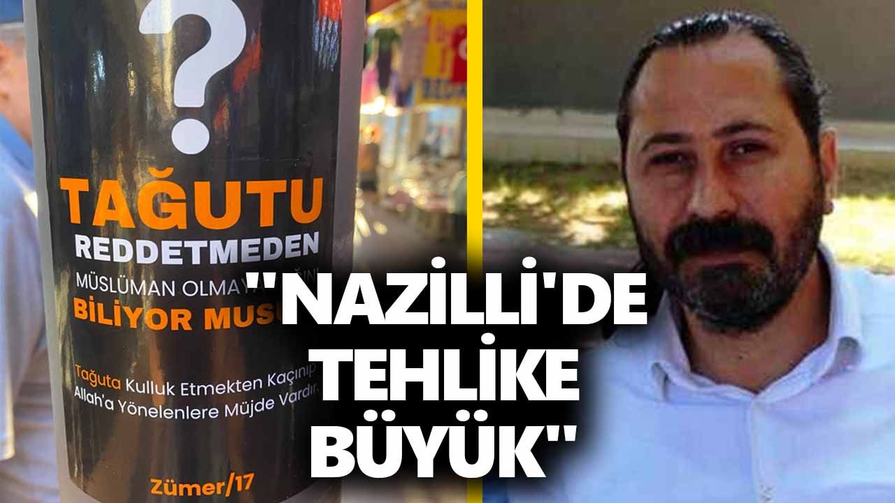 Nazilli Uzun Çarşı'da bir aydınlatma direğine üzerinde "Tağutu reddetmeden Müslüman olmayacağını biliyor musun" yazılı çıkartma asıldı.