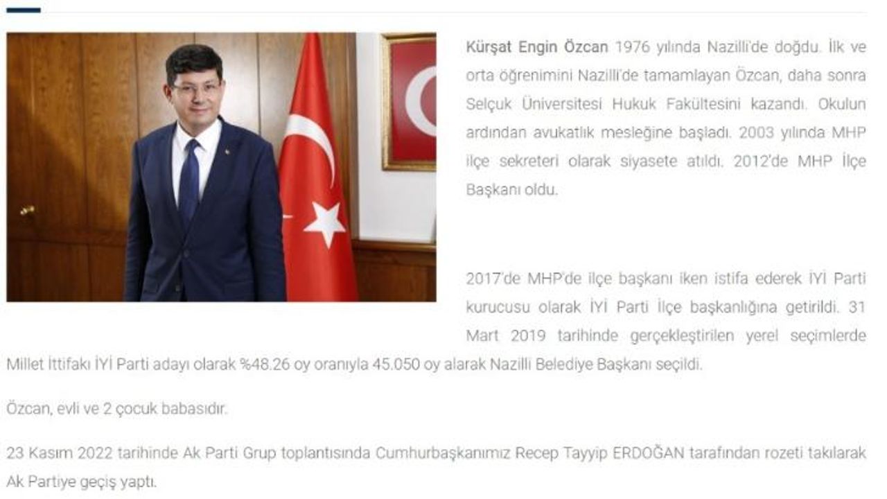 Nazilli Belediye Başkanlığı’na seçildiği İYİ Parti’den istifa ederek AK Parti’ye katılan Kürşat Engin Özcan’ın belediyenin internet sitesinde yer alan özgeçmişi güncellendi.