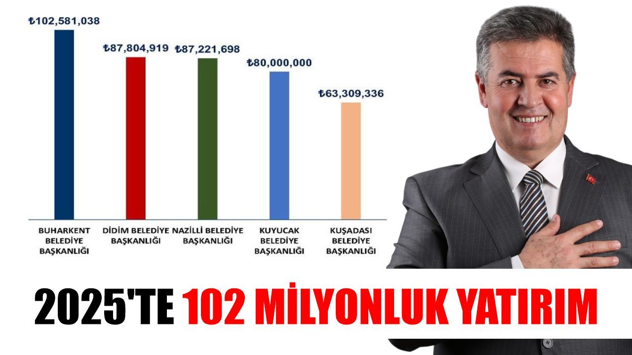 Aydın Valiliği İl Koordinasyon Kurulu Toplantısı’nda 2025 yılı proje tutarları verilerine göre ilçe belediyelerinin sıralaması açıklandı. Buna göre ilk beşe giren belediyeler arasında Buharkent Belediyesi 102 milyon 581 bin liralık yatırımla zirvede yer alırken, 87 miyon 804 bin liralık yatırımla Didim Belediyesi ikinci, 87 milyon 221 bin liralık yatırımla Nazilli Belediyesi üçüncü, 80 milyonluk yatırımla Kuyucak Belediyesi dördüncü, 63 milyonluk yatırımla Kuşadası Belediyesi beşinci sırada yer aldı.