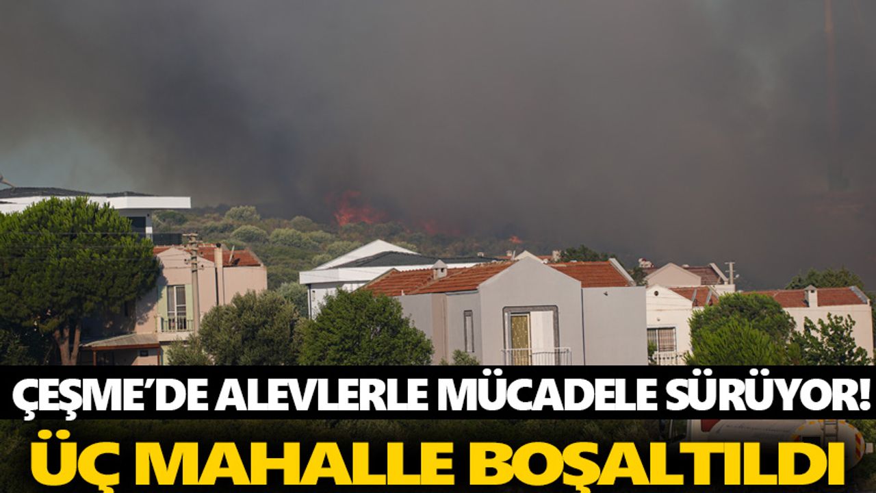 Çeşme ilçesinde etkili olan yangına 2 uçak ve 6 helikopter ile kara ekiplerinin müdahalesi sürüyor.