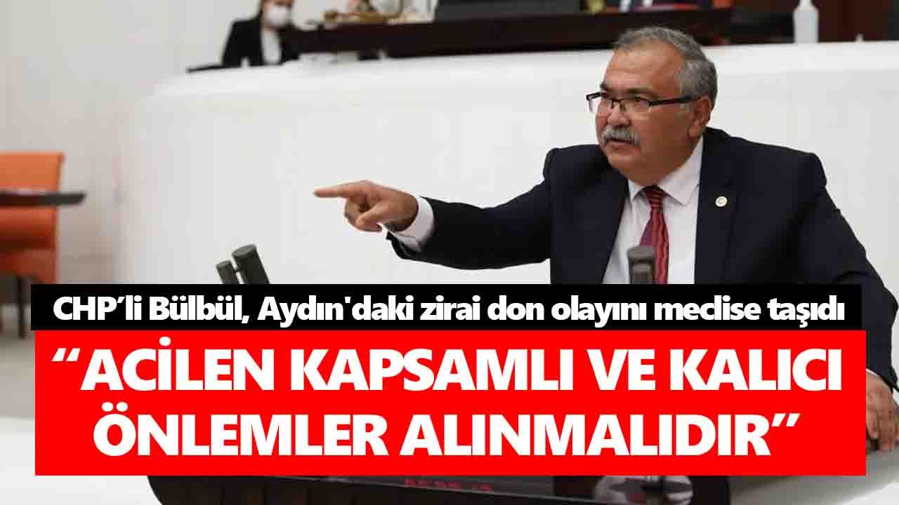 CHP Aydın Milletvekili ve TBMM Adalet Komisyonu CHP Grup Sözcüsü Süleyman Bülbül, çiftçinin mahsullerinin ziyan olmasına neden olan ziraii don olayını TBMM gündemine taşıdı. CHP’li Bülbül, Ekim ayında İncirliova’da yaşanan don felaketinin ardından pamuk başta olmak üzere pek çok tarım ürününün zarar gördüğünü söyledi. Son yıllarda artan zirai don olaylarına karşı mücadele edilmesi gerektiğini kaydeden CHP’li Bülbül, Tarım ve Orman Bakanı İbrahim Yumaklı’nın yanıtlaması istemiyle verdiği soru önergesinde şunları söyledi: