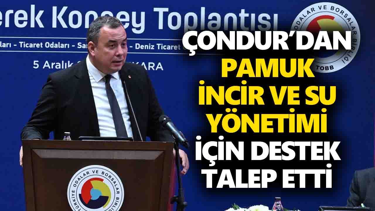 Devlet Su İşleri Genel Müdürlüğü tarafından yürütülen Muğla Dalaman Çayı’nın Bozdoğan Kemer Barajı’na bağlanması projesinin, Aydın için son derece anlamlı ve stratejik bir adım olduğunu dile getiren Çondur, projenin hızlandırılarak faaliyete geçirilmesini talep etti. Bu projenin hayata geçmesiyle tarımsal sulama kapasitesinin artacağını, üretimin sürdürülebilirliğinin güçleneceğini ve bölgedeki kuraklık sorununun önemli ölçüde hafifleyeceğini belirtti.