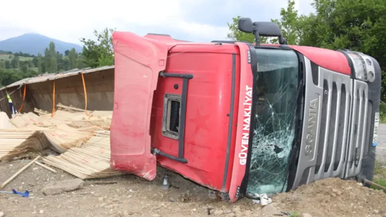 Amasya'nın Taşova ilçesinde O.K'nin (39) kullandığı 05 ABF 160 plakalı kontrplak yüklü tır, Boraboy mevkisinde devrildi.