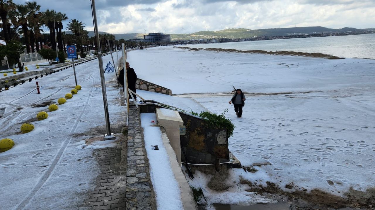 Çeşme'de beyaz bir manzaraya alışık olmayan bazı ilçe sakinleri ise çocuklarıyla plajda yürüyüş yaptı, dolu tanelerinden kartopu yapmaya çalıştı.