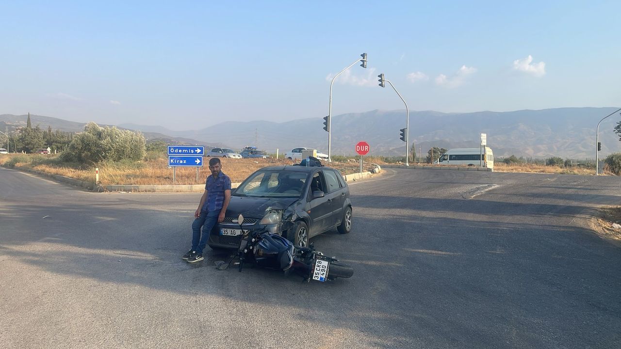 Kaymakçı Mahallesi'nde T.G. (40) yönetimindeki 35 CRB 490 plakalı motosiklet ile H.B. (42) yönetimindeki 35 AG 801 plakalı otomobil çarpıştı.