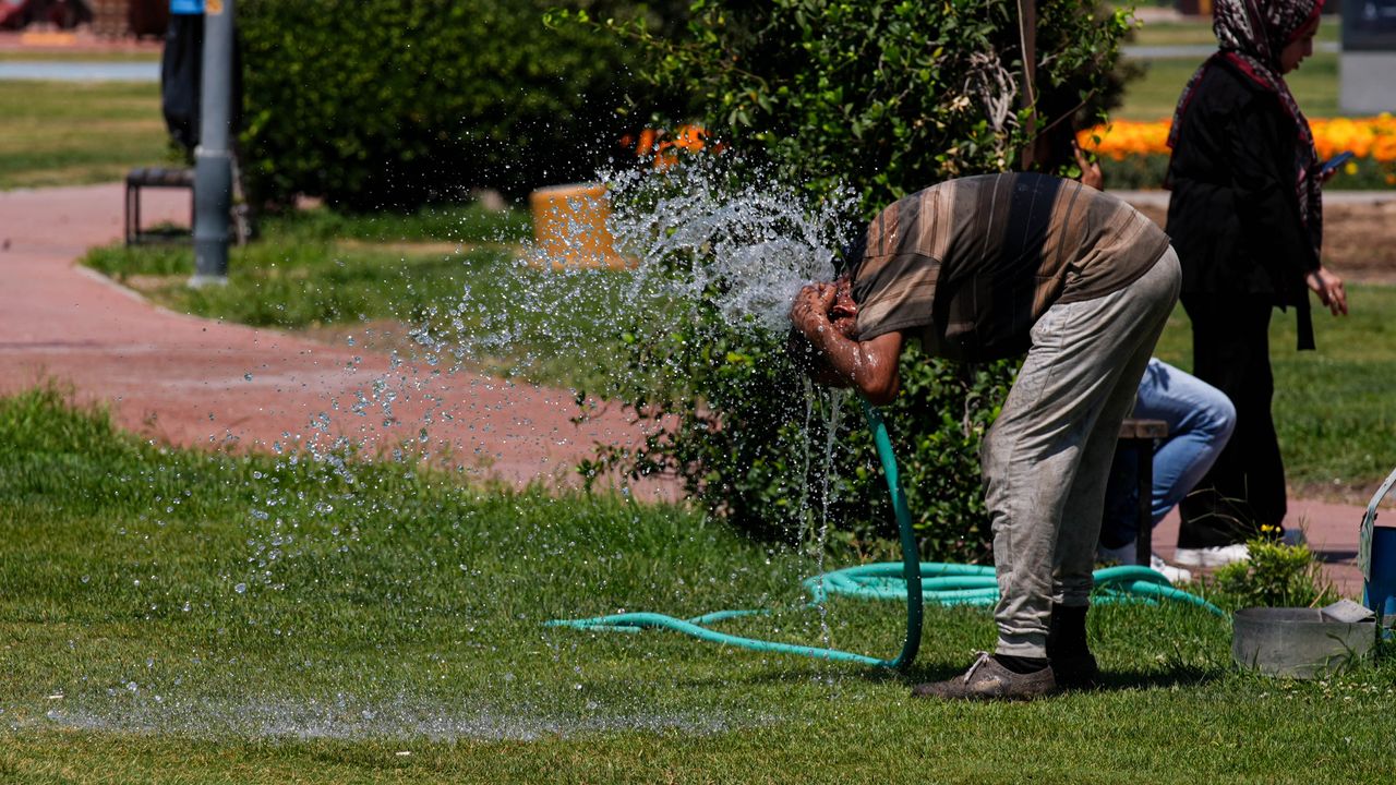 Sıcaktan bunalan bazı kişiler de parklarda çimlerin sulandığı hortumla serinlemeye çalıştı.