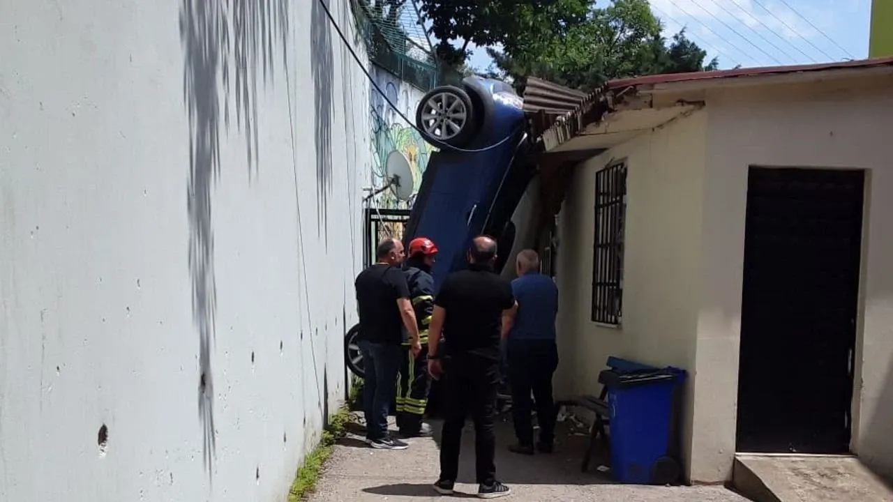 Kocaeli'nin Darıca ilçesinde istinat duvarından okul bahçesine düşerek asılı kalan otomobilin sürücüsü yaralandı.