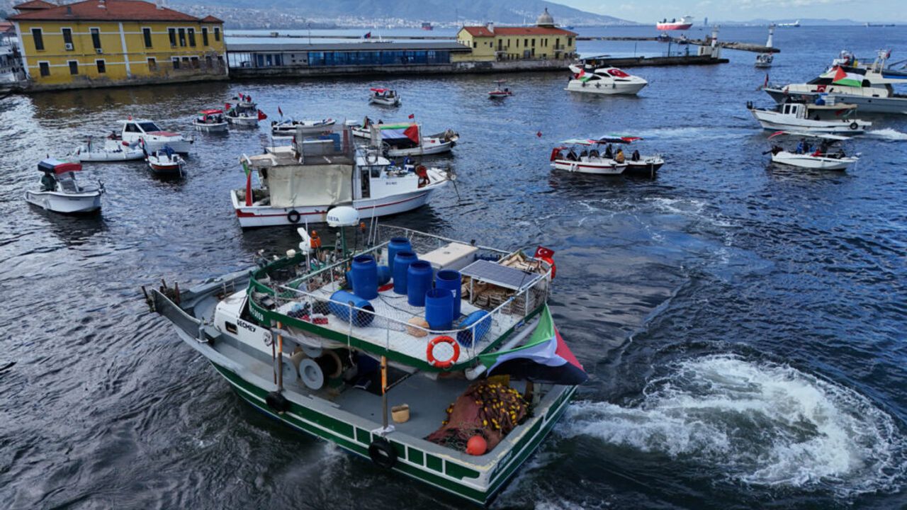 Filistin'e Destek Platformu tarafından organize edilen etkinlik kapsamında Bostanlı, Güzelbahçe, Sahilevleri, İnciraltı ve Mavişehir'deki balıkçı barınaklarından hareket eden tekneler Cumhuriyet Meydanı önünde buluştu.