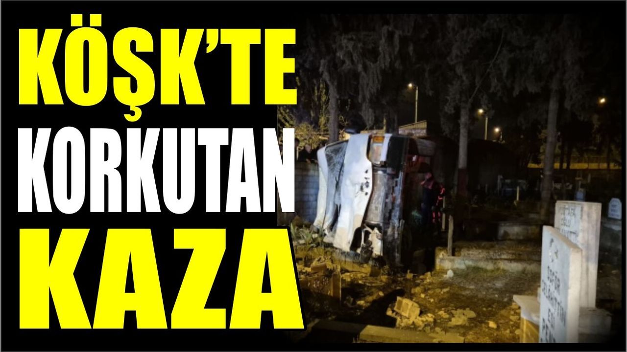 Köşk ilçesinde kontrolden çıkan panelvan, mezarlık duvarını aşarak alana devrildi. Kazada araçta bulunan 3 kişi yaralanırken, ihbar üzerine olay yerine polis ve sağlık ekipleri sevk edildi. Yaralılar hastaneye kaldırılarak tedavi altına alındı. Kazada mezarlık içerisindeki bazı mezarların da zarar gördüğü öğrenildi.