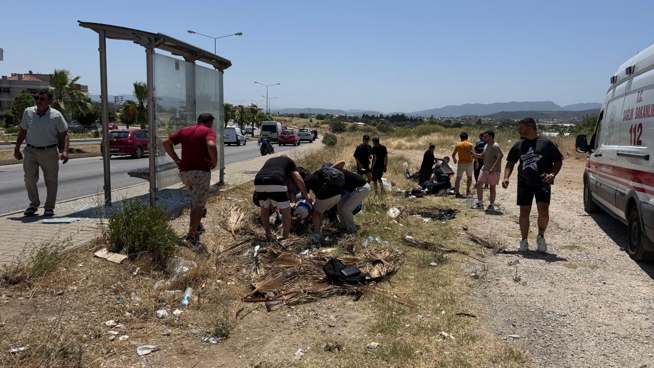 İzmir'in Menderes ilçesinde motosikletin otobüs durağında bekleyen yayaya çarptığı kazada 2 kişi yaralandı.