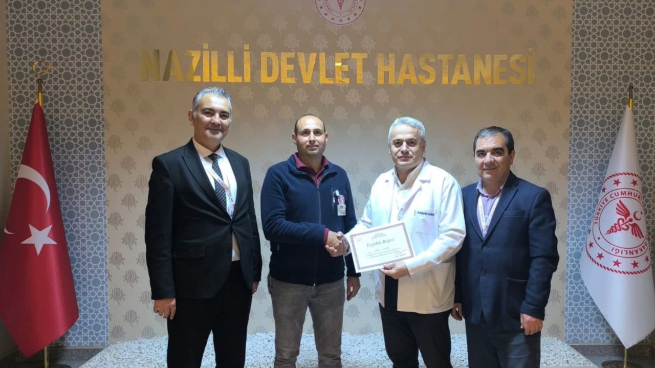 Nazilli Devlet Hastanesi yönetimi hastane bahçesinde bulduğu 3 altını idareye teslim ederek sahibine ulaştırılmasını sağlayan temizli görevlisi Ferdi Şimşek'e teşekkür belgesi takdim etti.