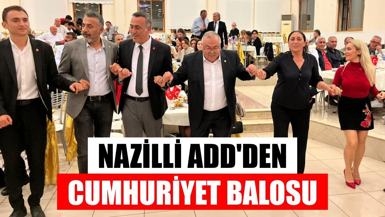 Atatürkçü Düşünce Derneği (ADD) Nazilli Şubesi, 29 Ekim Cumhuriyet Bayramı'nı münasebetiyle kutlama balosu düzenledi. Enver Yetkiner Düğün Salonu’nda, ADD Nazilli Şube Başkanı Feyzullah Erkut'un ev sahipliğinde gerçekleşen baloya CHP Aydın Milletvekili Süleyman Bülbül, Nazilli Belediye Başkanı Ertuğrul Tetik, Belediye Başkan vekili Selahattin Yılmaz, CHP Nazilli İlçe Başkanı Aslı Ökmen, NTO Başkanı Nuri Arslan, İYİ Parti ilçe başkanı Hasan Akol, muhtarlar, sivil toplum kuruluşu temsilcileri, ADD üyeleri ile davetliler katıldı.