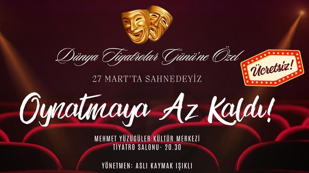 Dünya Tiyatrolar Günü kapsamında Nazilli yerel belediye tiyatro grubu, “Oynatmaya Az Kaldı” adlı oyunla sanatseverlerle buluşuyor. Yönetmenliğini Aslı Kaymak Işıklı’nın üstlendiği oyun, 27 Mart Cuma günü saat 20.30’da Mehmet Yüzügüler Kültür Merkezi Tiyatro Salonu’nda ücretsiz olarak sahnelenecek.