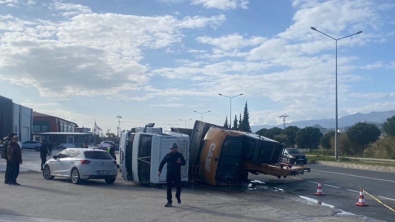 A.A’nın kontrolünde olan 09 R 8103 plakalı kamyon, İsabeyli Mahallesi'nde bir alışveriş merkezi önünde hatalı şerit değiştiren otomobile çarpmamak için yaptığı manevra sırasında devrildi.