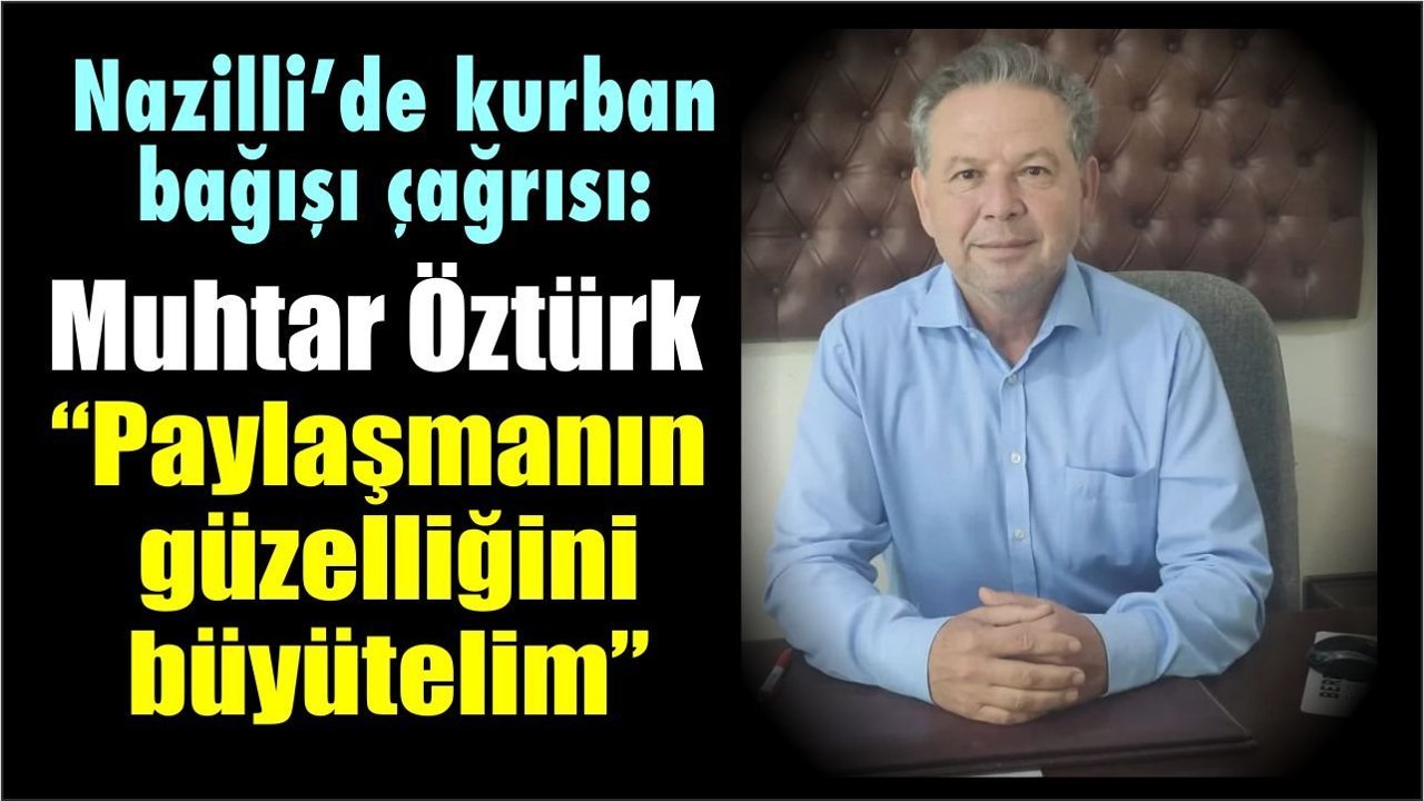 Göreve geldiği günden bu yana çok sayıda sosyal yardım kampanyasına imza atan Nazilli Yeşil Mahalle Muhtarı Şenol Öztürk Kurban Bayramı yaklaşırken hayırseverlere çağrıda bulundu. Geçen yıl hayırseverlerin desteğiyle ihtiyaç sahibi 10 aileye kurbanlık koyun hediye edildiğini hatırlatan Muhtar Öztürk bu yıl ise 20 aileye kurbanlık vermeyi amaçladıklarını belirtti. Hayırseverlere çağrıda bulunan Öztürk "Daha çok aileye ulaşabilmek, bu güzel dayanışmayı büyütebilmek için, kurban bağışı yapmak isteyen hemşehrilerimizle şimdiden bir iletişim ağı kurmayı planlıyoruz" dedi.