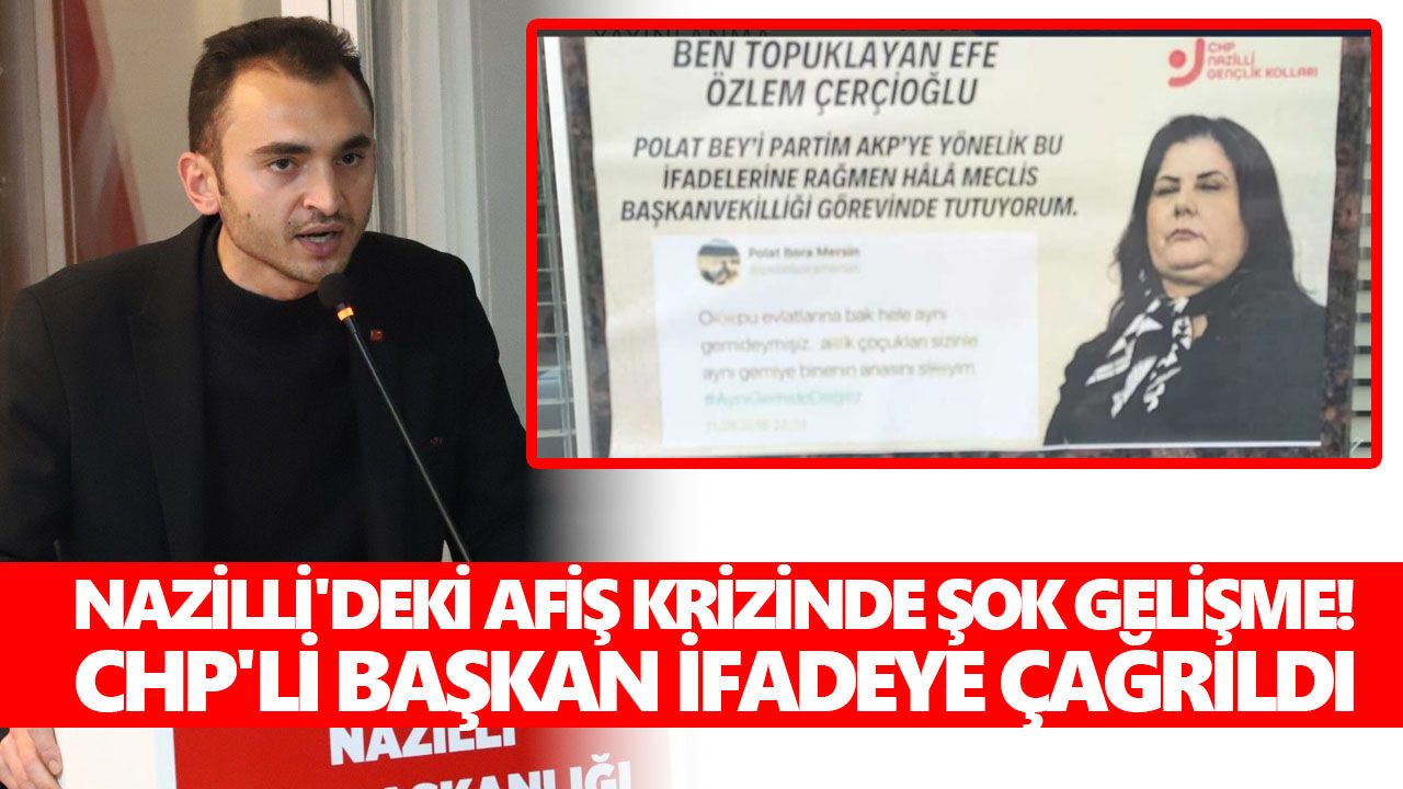 Nazilli'de CHP ve AK Parti arasında afiş krizi yaşandı. CHP Nazilli Gençlik Kolları tarafından şehrin bazı noktalarına asılan ve Aydın Büyükşehir Belediye Başkanı Özlem Çerçioğlu'nu hedef alan afişler nedeniyle Çerçioğlu şikayette bulundu. Bunun üzerine CHP Nazilli İlçe Gençlik Kolları Başkanı Mustafa Kemal Koç emniyet tarafından ifadeye çağrıldı.
