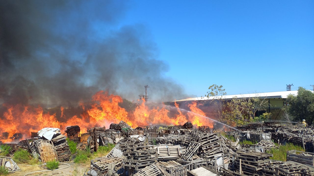 Manisa'nın Yunusemre ilçesinde Muradiye Mahallesi'ndeki fabrikanın eski paletlerin depolandığı alanında, henüz belirlenemeyen nedenle yangın çıktı.