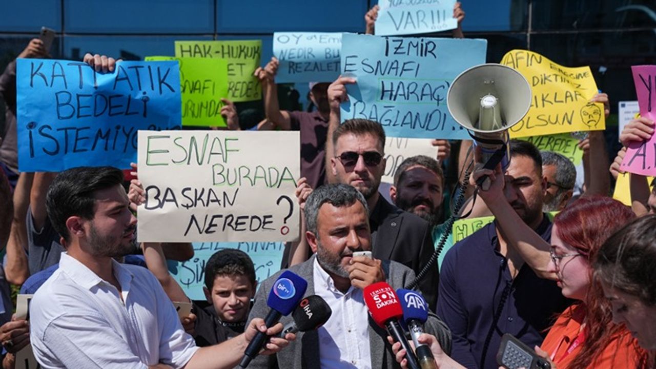 İzmir'in Karabağlar ilçesinde, Karabağlar Belediyesi önünde bir araya gelen bir grup pazarcı, slogan attı.