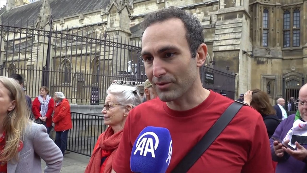 İngiltere'nin İsrail'e silah satışını protesto için göstericilerin ellerindeki metrelerce uzunluktaki kırmızı örtüyle başkent Londra'da parlamento binasının etrafında insan zinciri oluşturarak sembolik "kırmızı duvar" ördüğü eyleme katılan oyuncu Abdalla, AA muhabirine konuştu.