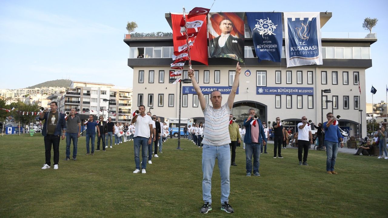 Kuşadası’nda sarı beyaz kıyafetleri ve çaldıkları marşlarla resmi bayramlara renk ve coşku katan yarım asırlık Şehit Kaya Aldoğan Lisesi Veteran Boru ve Trampet takımı, Cumhuriyet’in ilanının 100’üncü yılı kutlamaları için hazırlıklarını tamamladı. Kuşadası Belediyesi tarafından 29 Ekim’de gerçekleştirilecek olan Cumhuriyet kortejinde Kuşadalıların karşısına çıkmak için yaklaşık 1 aydır hazırlanan ekip üyeleri, son provasını Kuşadası Belediyesi Hizmet Binası önünde yaptı. Kuşadası Belediyesi tarafından yenilenen ekipmanlarla yapılan provayı, Belediye Başkan Vekili Seyfi Seyhan Suvari, Belediye Başkan Yardımcısı Oğuzhan Turan ve ekip üyelerinin aileleri de izledi. Kuşadası Şehit Kaya Aldoğan Lisesi Veteran Boru ve Trampet takımı prova sırasında, yerli ve yabancı turistlerin de ilgi odağı oldu.