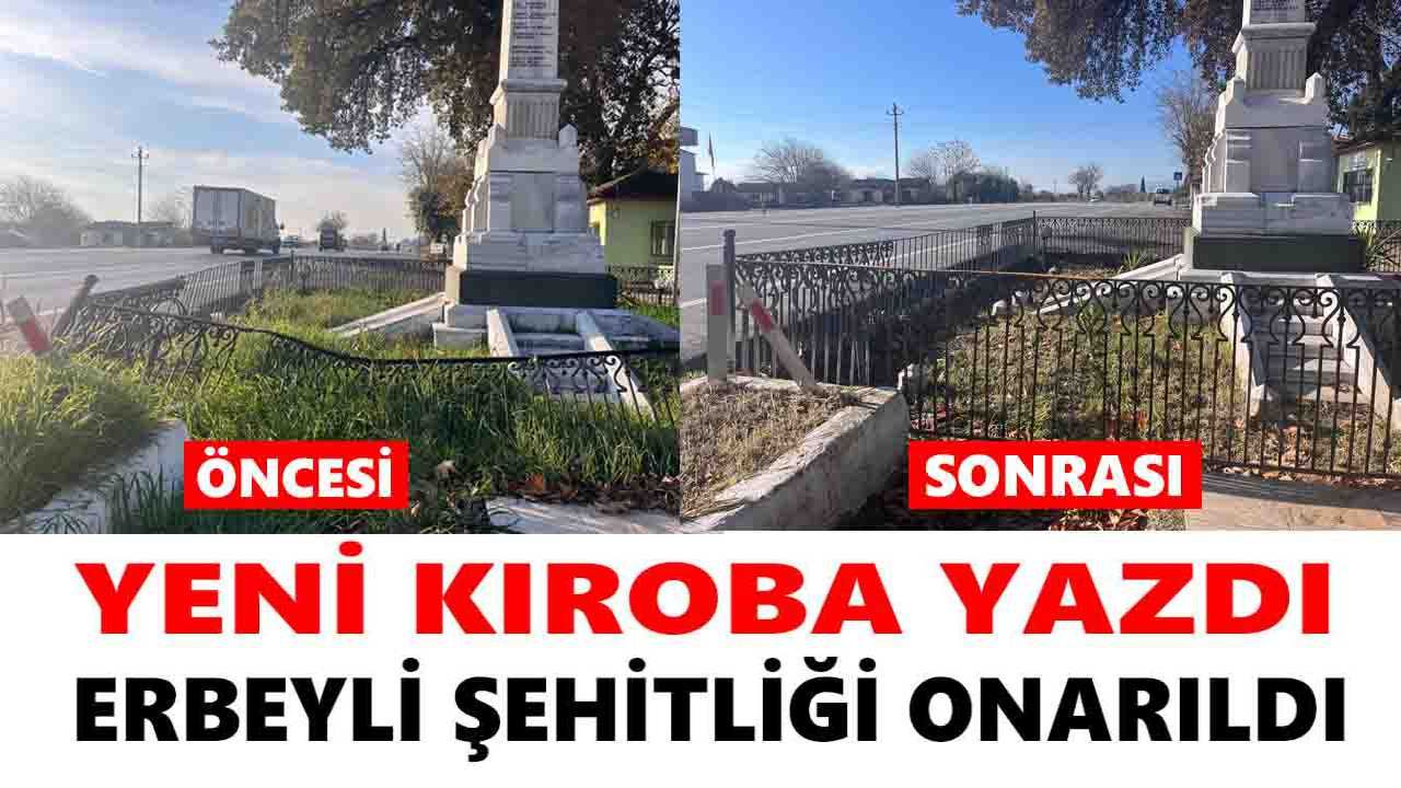 Yeni Kıroba’da yayımlanan haberin ardından Erbeyli Şehitliği’nde harekete geçildi. İncirliova’nın Erbeyli Mahallesi’nde bulunan, Milli Mücadele’nin simge noktalarından Erbeyli Şehitliği ve Erbeyli Şehitleri İlk Kurşun Abidesi, yapılan temizlik ve bakım çalışmalarıyla daha düzenli bir görünüme kavuştu.