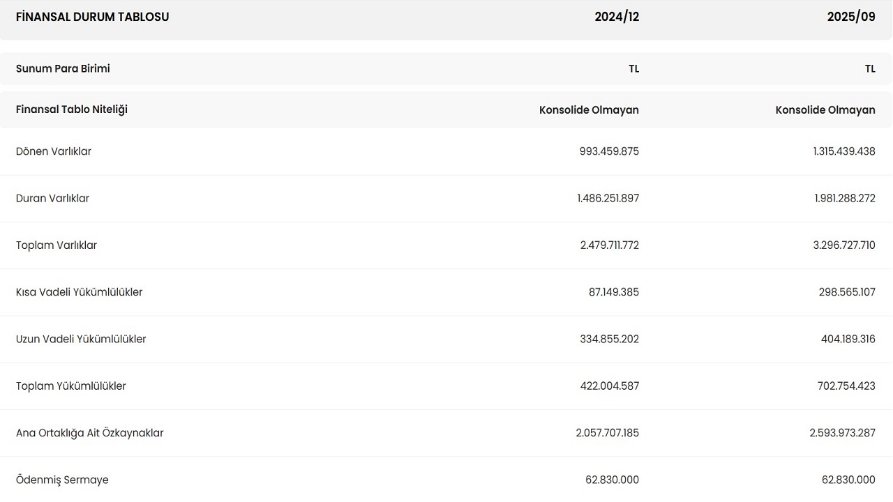Son 3 ay içerisinde dönen varlıkları azalan ve duran varlıkları da artan şirketin; 2 kalemdeki artış ve azalışın birbirini tolere etmesi ile birlikte toplam varlıklarında kayda değer bir değişim yaşanmadı ve 3,29 milyar TL seviyesinde gerçekleşti.