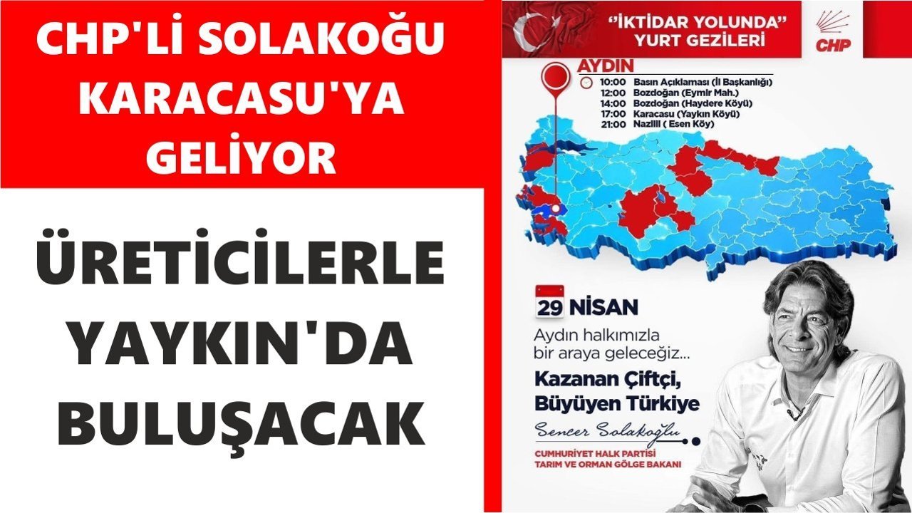 Cumhuriyet Halk Partisi (CHP)'nin Tarım ve Orman Gölge Bakanı Sencer Solakoğlu Aydın programı kapsamında Karacasu'ya bağlı Yaykın Mahallesi'ne geliyor. 29 Nisan 2026 Çarşamba günü saat 17:00'de başlayacak buluşmada Solakoğlu üreticilerin sorun ve talepleri dinleyerek partisinin tarım politikalarını anlatacak.