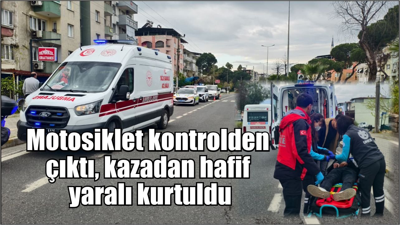 Edinilen bilgiye göre, karayolunda seyir halinde olan 09 R 9753 plakalı motosikletin sürücüsü C.G., henüz belirlenemeyen bir nedenle motosikletin kontrolünü kaybetti.Kontrolden çıkan motosikletten düşerek asfalt zemine savrulan sürücü C.G. yaralandı.